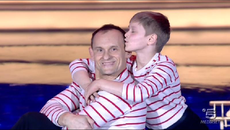Ore 22.12: è il momento di Igor e Andrea Matyuschenko, padre e figlio, due bravissimi acrobati. Il padre tiene sospeso in aria il figlio con il solo palmo della mano.