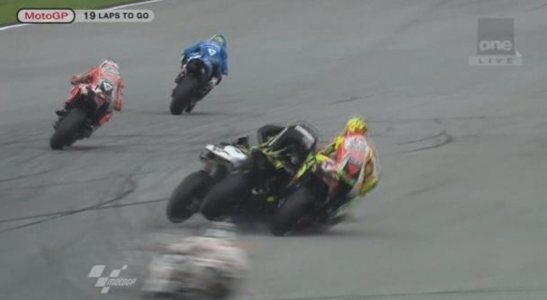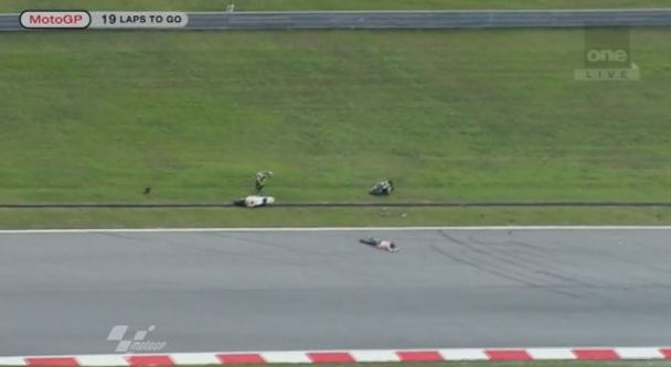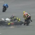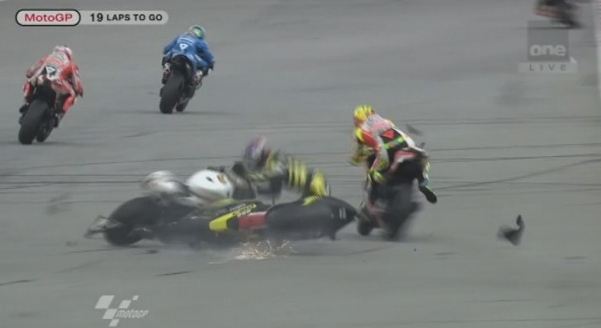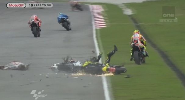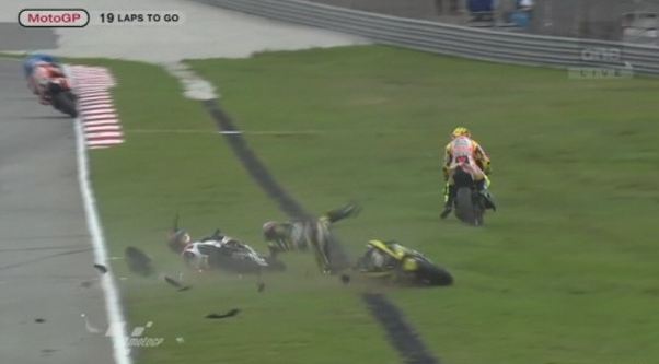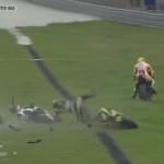 Il gravissimo incidente, avvenuto al secondo giro, ha coinvolto, oltre a Simoncelli (Honda), Colin Edwars (Yamaha) e Hiroshi Aoyama (Honda). A terra, senza casco, volato via, e’ rimasto Marco, e altri piloti, Colin Edwards e il suo grande amico Valentino Rossi, non sono riusciti ad evitarlo investendolo letteralmente. L’incidente ha decretato da subito la cancellazione della gara.