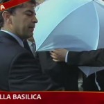 La stessa Cuccarini, colpevole di non aver fatto mente locale su quella battuta poco gradita, si associa alle scuse del suo ospite in studio, rammentando il massimo rispetto da portare in occasioni come queste dove un insulto a Dio, per di più sul sagrato di una Chiesa, è decisamente inammissibile. Intanto, scopriamo che, nelle intenzioni della Marini, l’abito da sposa dovesse essere celato fino all’ultimo dai bodyguard e dagli ombrelli anche durante la discesa delle scale a cerimonia conclusa (probabilmente per un’esclusiva concessa). Peccato che su Twitter siano già circolate delle foto come vedete nell’immagine di apertura di questo post.