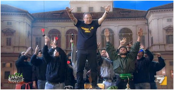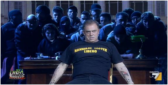 Nella inedita gag, è stato lo stesso Presidente della Repubblica (sempre interpretato da Crozza) a cedere la sua poltrona al capo ultrà. “Per la curva è sprecato, io gli faccio comandare tutto il Paese” ha detto il finto Giorgio Napolitano, battendo in ritirata. E così, accompagnato da uno stuolo di tifosi esagitati, è entrato in scena l’alter ego tragicomico di Genny ‘a Carogna. Il capo ultrà, con indosso una maglietta con la scritta “Hannibal Lecter libero”, ha scandito alcuni slogan e poi ha dato prova delle sue capacità di Capo dello Stato sui generis.