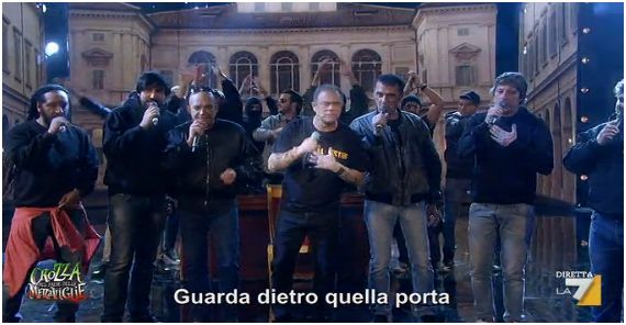 Poi un appello vagamente mafioso agli italiani. “Quelli che vogliono restare in Italia ci devono dare la metà di quello che guadagnano. Noi in cambio vi proteggiamo…” ha proposto Maurizio-Genny, indicando una tanica di benzina come minaccia di fronte al mancato pagamento. Il capo ultrà ha inoltre deciso di mettere mano ai cori da stadio, e in scena sono apparsi a sorpresa i Neri per Caso, pronti ad intonare con Crozza un rap sulle anomalie del Paese, a cominciare dagli incresciosi fatti avvenuti sabato scorso alla finale di Coppa Italia.