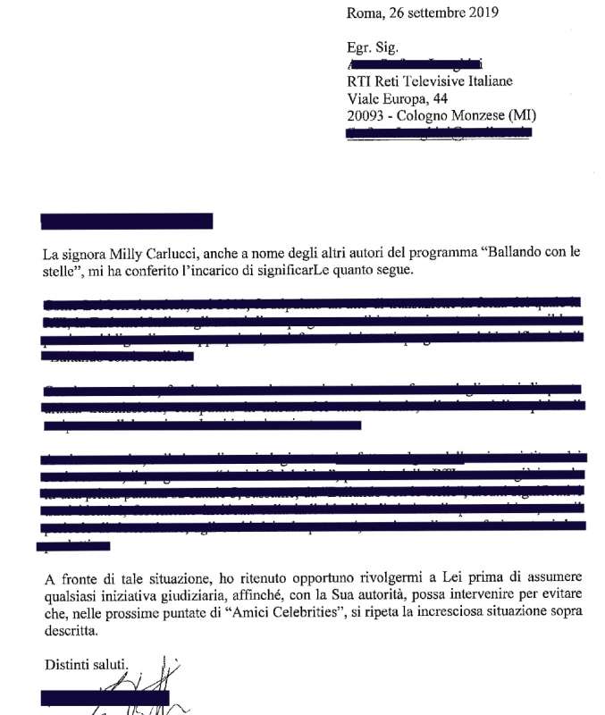 “La signora Milly Carlucci, anche a nome degli autori del programma “Ballando con le stelle”, mi ha conferito l’incarico di significarLe quanto segue (…) A fronte di tale situazione, ho ritenuto opportuno rivolgermi a Lei prima di assumere qualsiasi iniziativa giudiziaria, affinché, con la Sua autorità, possa intervenire per evitare che, nelle prossime puntate di “Amici Celebrities”, si ripeta la incresciosa situazione sopra descritta.”