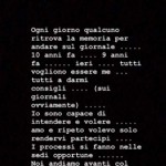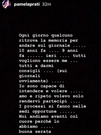 “Ogni giorno qualcuno ritrova la memoria per andare sul giornale… 10 anni fa… 9 anni fa… ieri… tutti vogliono essere me… tutti a darmi consigli… (sui giornali ovviamente)… Io sono capace di intendere e di volere… amo e ripeto volevo solo rendervi partecipi… I processi si fanno nelle sedi opportune… Noi andiamo avanti col cuore perchè lo abbiamo… buona serata”.