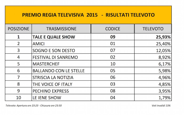 Premio Tv 2015 – Top Ten: Amici, Festival di Sanremo 2015, The Voice of Italy, Le Iene Show, Ballando con le stelle, Striscia la notizia, Sogno e son desto, Pechino Express, Tale e Quale Show, MasterChef
