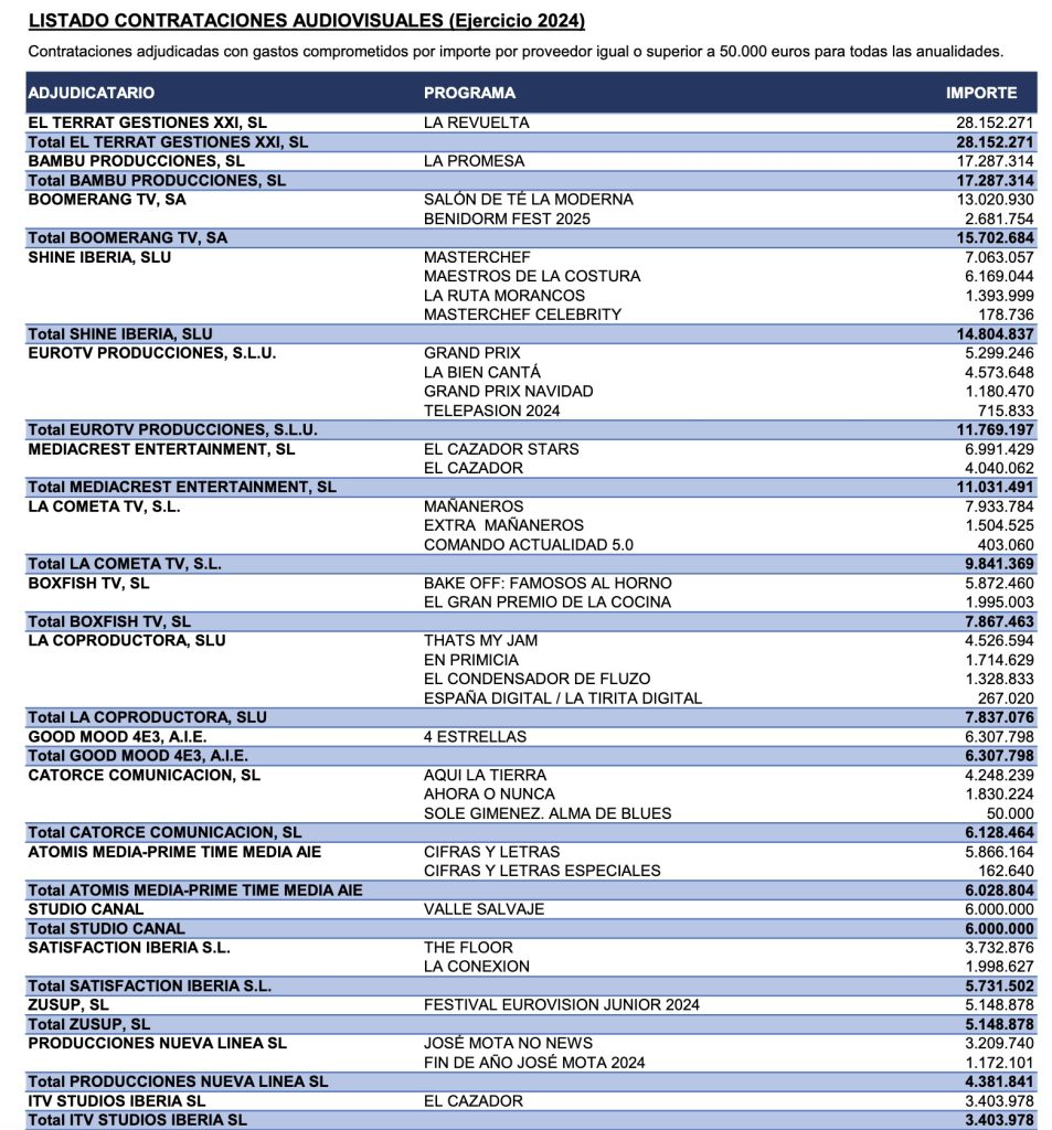 Spulciando i dati, si nota che il programma più costoso nel 2024 è La Revuelta, un talk quotidiano che ha cambiato lo scenario dell’access prime time in Spagna, con la TV pubblica che ha minato il primato di Antena 3, con il talk El Hormiguero (i cui diritti sono stati acquistati da Mediaset). Il costo è di 28.152.271 euro. Al secondo posto, forte di oltre 200 episodi, troviamo La Promessa, che ha avuto un ruolo determinante nel palinsesto, riuscendo ad accendere il pomeriggio della rete. Il costo è di 17.287.314 euro. Entrambi rappresentano gli unici prodotti delle rispettive case di produzione: El Terrat Gestiones XXI e Bambú Producciones.
