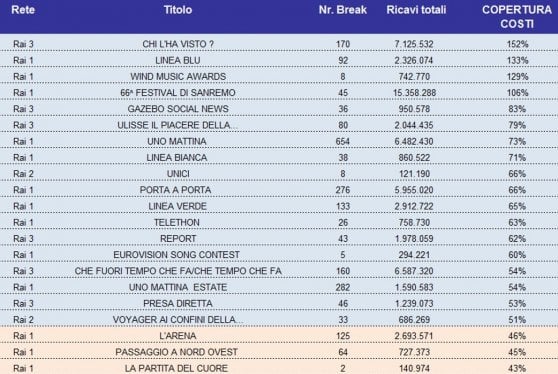 Che in Rai il canone foraggi quasi tutte le trasmissioni, è cosa nota. Meno risaputo, invece, è il numero risicatissimo di programmi autosufficienti, in grado cioè di sostenersi interamente grazie ai ricavi pubblicitari. Nel 2017 appartenevano a questa categoria le già citate Chi l’ha visto?, Linea Blu, assieme ai Wind Music Awards e al Festival di Sanremo.