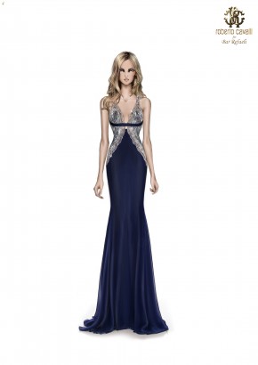 Abito fluido dalla linea a sirena in georgette di seta blu. Lo scollo è ricamato con motivi floreali che si assottigliano a formare le spalline dell’abito e scendono sul davanti a contrasto con le geometrie delle coppe. Il corpino è interamente ricamato all over con paillettes nei diversi toni dell’argento, canna di fucile e del blu.