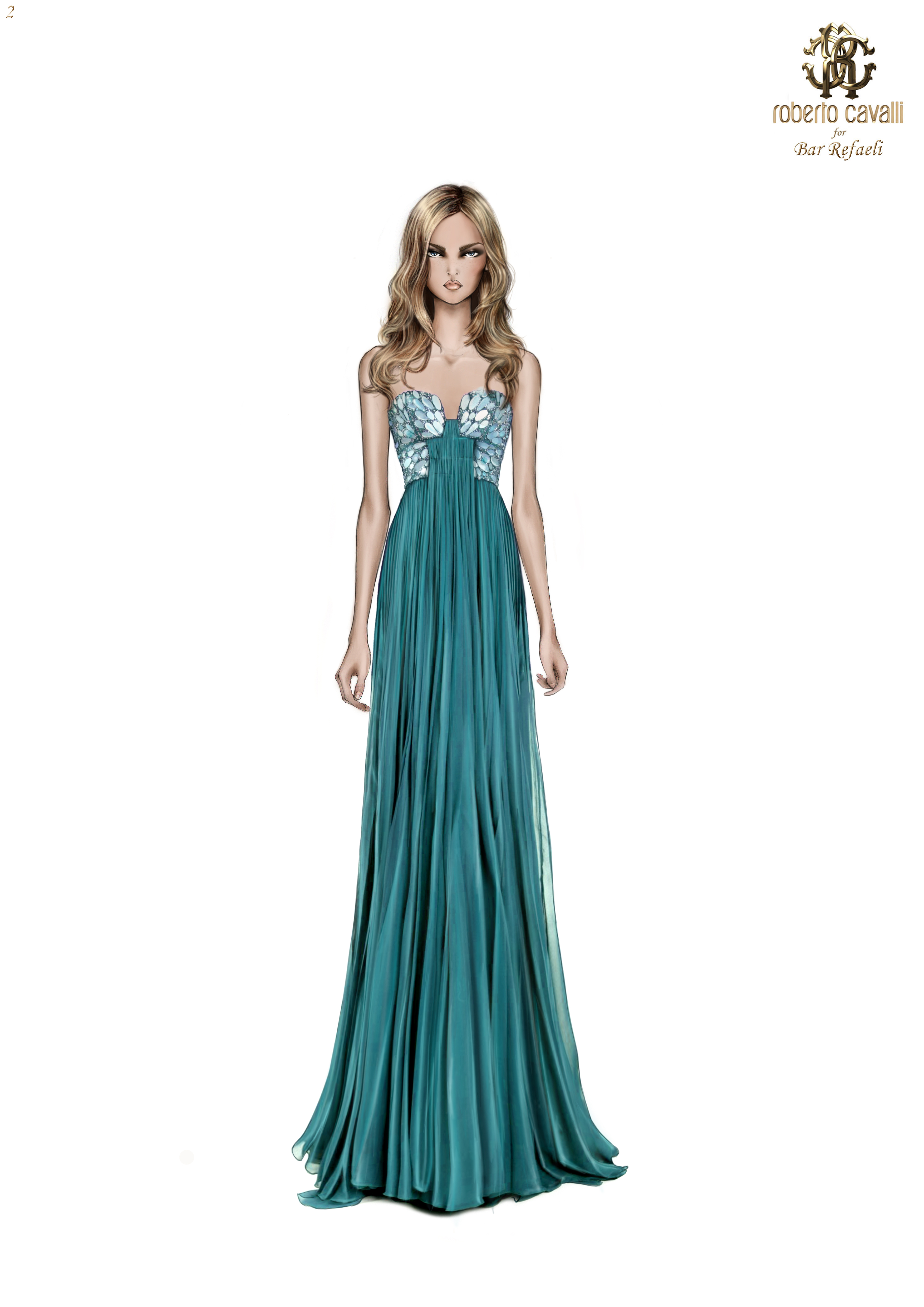 Abito strapless in mousseline di seta color turchese con ampia gonna in plissè soleil. Speciali lenti soffiate artigianalmente ed arricchite con spray di cristalli in tono creano un motivo a farfalla sul bustier.