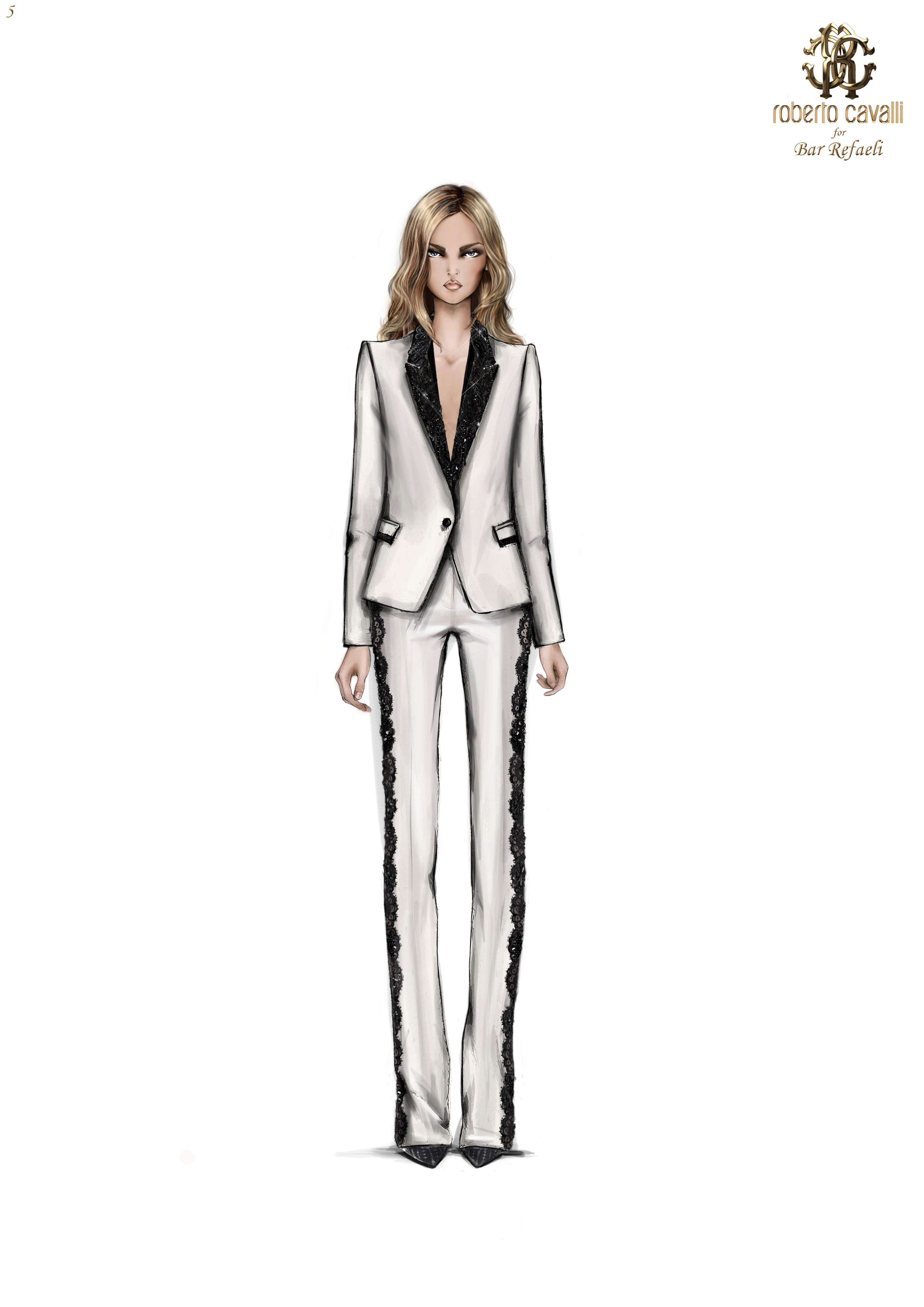 Tuxedo esclusivo in cady di seta color avorio. Il completo è impreziosito da inserti di pizzo nero,per un effetto a contrasto, ricamati con paillettes in cristallo Black Jet.