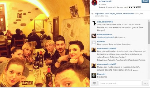 Arisa, invece, che ha catturato l’attenzione dei social sul suo decolleté con il primo abito indossato, ha postato, ieri notte, una foto a cena, commentando con una sfilza di cuoricini:
