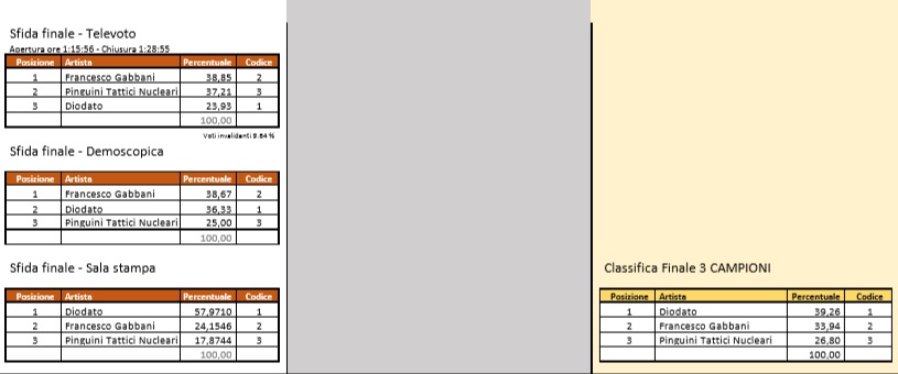 Netta la terza posizione dei Pinguini Tattici Nucleari, mentre la vittoria finale a Diodato è andata soprattutto per la percentuale ‘monstre’ ottenuta nella Sala Stampa, senza la quale Gabbani avrebbe agguantato il primo posto.