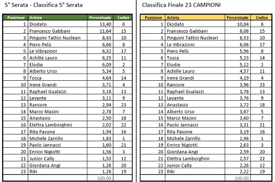 Nella graduatoria finale, i Pinguini Tattici Nucleari sono riusciti a ‘scalzare’ Le Vibrazioni con solo lo 0,47% dei voti in più. Junior Cally ha ‘regalato’ l’ultimo posto a Riki con lo 0,04% di scarto. Giordana Angi non ha mai superato la Top20, così come Enrico Nigiotti: la prima, nella graduatoria della quinta serata, si è fermata al 22esimo posto, risalendo al 20esimo nel cumulo totale delle serate. Il ragazzo, invece, è passato dal 20esimo al 19 posto. Ultimo posto netto per Riki.
