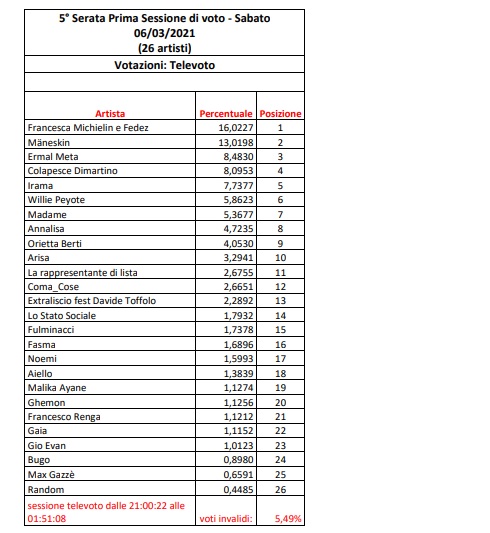 Nel televoto della serata finale, a contendersi il ruolo di vincitori della 71esima edizione sono stati Francesca Michielin e Fedez, con il 16,0227% ed i Maneskin, votati dal 13,0198%. Il pubblico ha premiato pure Ermal Meta, piazzandolo al terzo posto dei più votati della serata con l’8,4830%. I tre, con la somma delle graduatorie fatta nel corso delle prime quattro serate, sono dunque risultati sul podio con pochissimo scarto, con dominio del duo di Chiamami per Nome (balzato dalla 17, delle prime serate, alla posizione numero 1). Nessuna sorpresa nemmeno per Colapesce e Di Martino, Irama e Willie Peyote, che hanno confermato, sia al televoto, sia nella graduatoria generale, la quarta, quinta e sesta posizione. Con il 5,3677%, la settima Madame ha superato Annalisa (4,7235%) coi voti del pubblico, ma poi la loro situazione si è ribaltata con il cumulo di tutte le altre classifiche. Postazione coerenti anche per Orietta Berti, Arisa e La Rappresentante di Lista, rispettivamente nona, decima e undicesimi per il televoto e per la graduatoria finale.