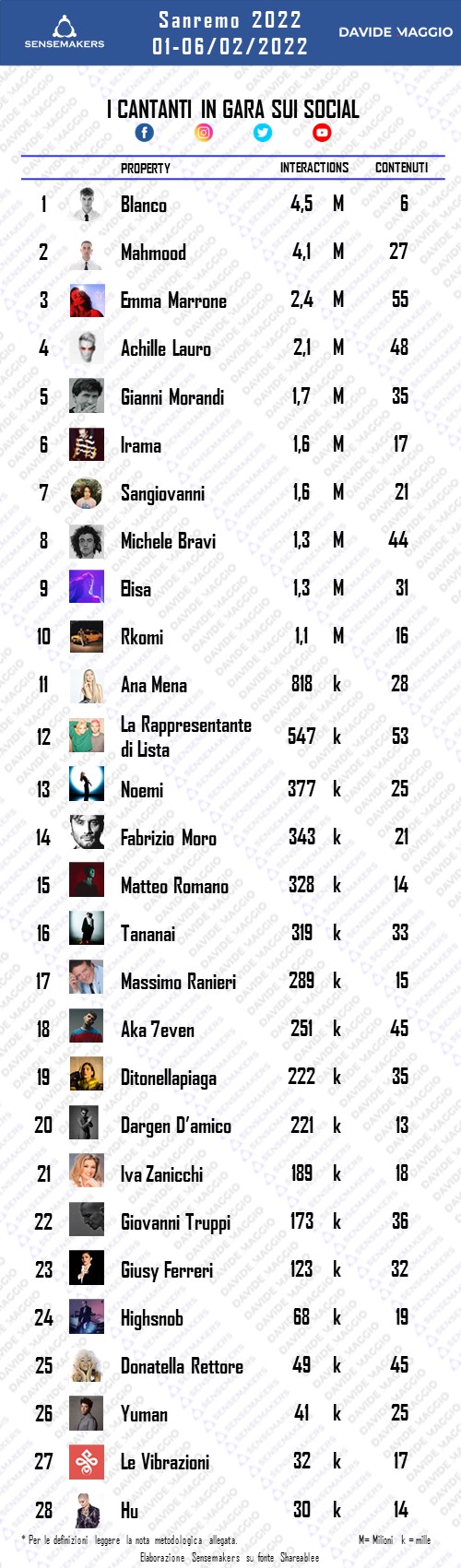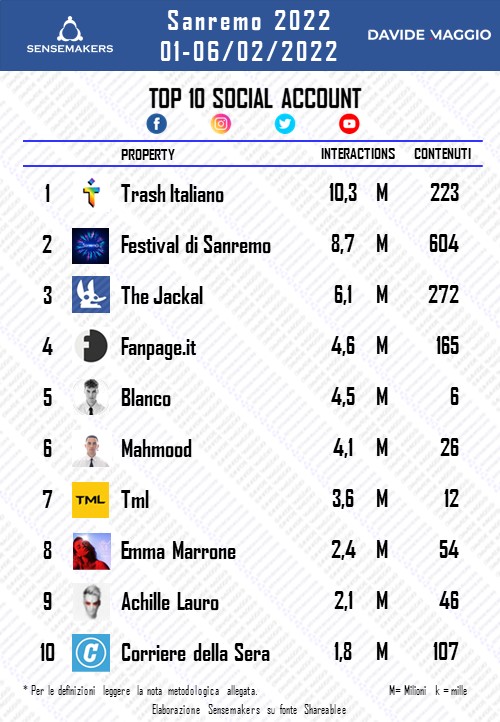 Nel monitoraggio sono presi in considerazione pagine pubbliche e account business verificati inclusi all’interno del database Shareablee, per un totale di circa 20mila pagine social pubbliche. Sono presi in considerazione i post pubblicati nel periodo di riferimento che includano nel testo parole afferenti alla manifestazione Sanremo (a titolo di esempio “sanremo”, “sanremo2022”, “festival di sanremo”, “festivaldisanremo”, “festivalsanremo”, “amadeus”, “teatro ariston”, etc.).