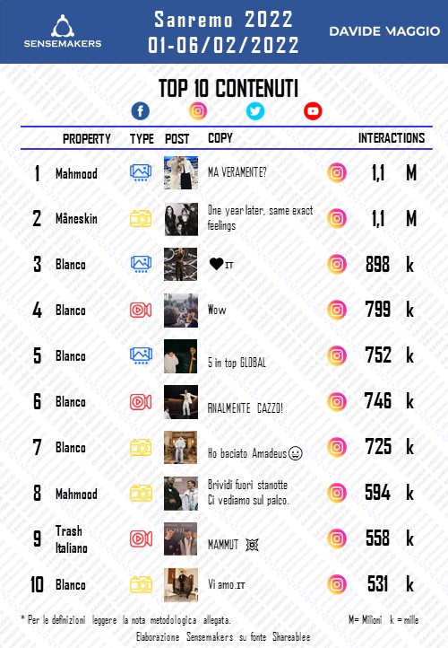 Vittoria a 360 gradi per Mahmood e Blanco: il Festival di Sanremo 2022 è finito ed è ora di bilanci anche lato social. Se Blanco è il cantante più “influente” (4,5 milioni di interazioni), Mahmood ha pubblicato il post sanremese che ha creato più interazioni dall’1 al 6 febbraio 2022, così come evidenzia l’analisi Sensemakers per DavideMaggio.it. Si tratta del “Ma Veramente?” postato dopo il trionfo di sabato che ha ottenuto 1,1 milioni di interazioni su Instagram. A differenza di quanto accaduto in gara, peraltro, Mahmood e Blanco sono sempre stati in testa alle classifiche social dei cantanti per tutta la settimana sanremese. Una vittoria “annunciata dai social”? (qui i dati dopo la prima serata)