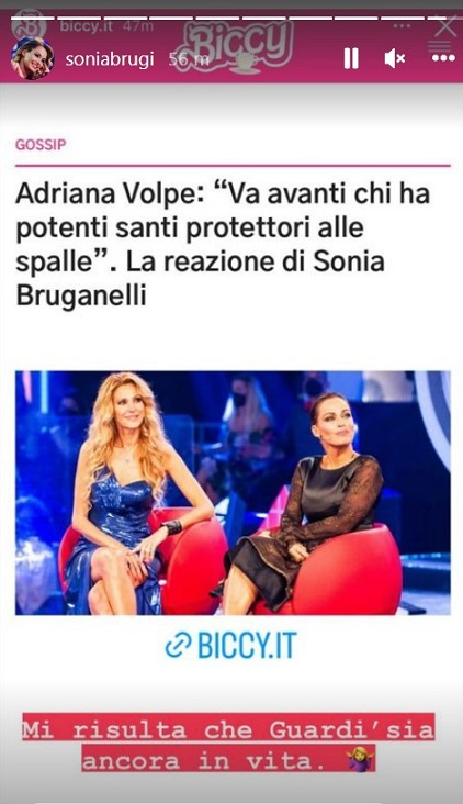 8 commenti su "Sonia Bruganelli punge Adriana Volpe sui ‘santi protettori’: «Mi risulta che Guardì sia ancora in vita»"