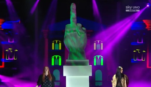22.31: In attesa di conoscere il verdetto della prima manche, il conduttore Alessandro Cattelan annuncia sul palco il duo svedese che ha conquistato il mondo: le Icona Pop.