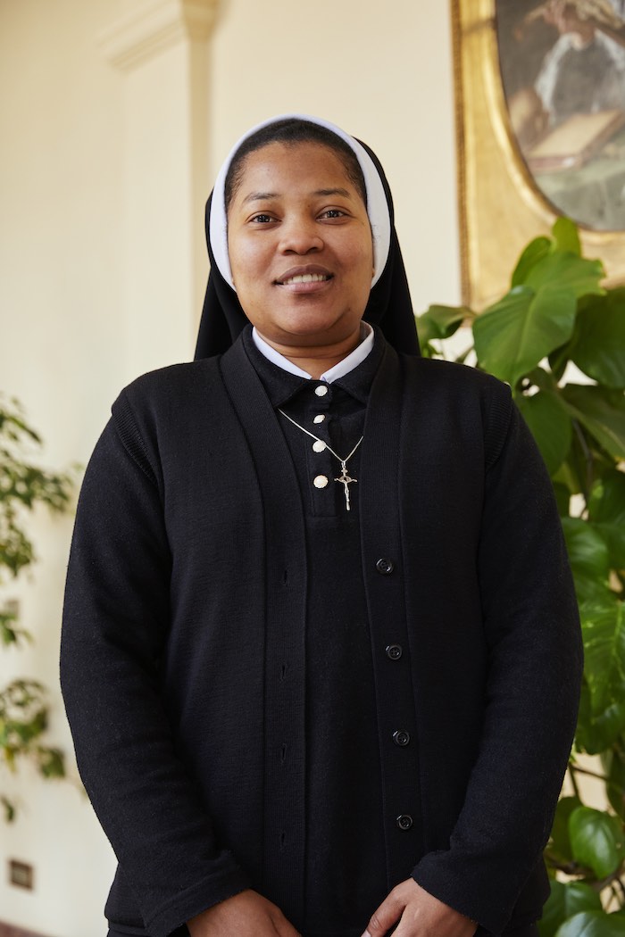 Laureata in Giurisprudenza, elabora le buste paga e gestisce il personale di tutta la provincia italiana della Congregazione. Le piace organizzare le feste, riordina il refettorio.